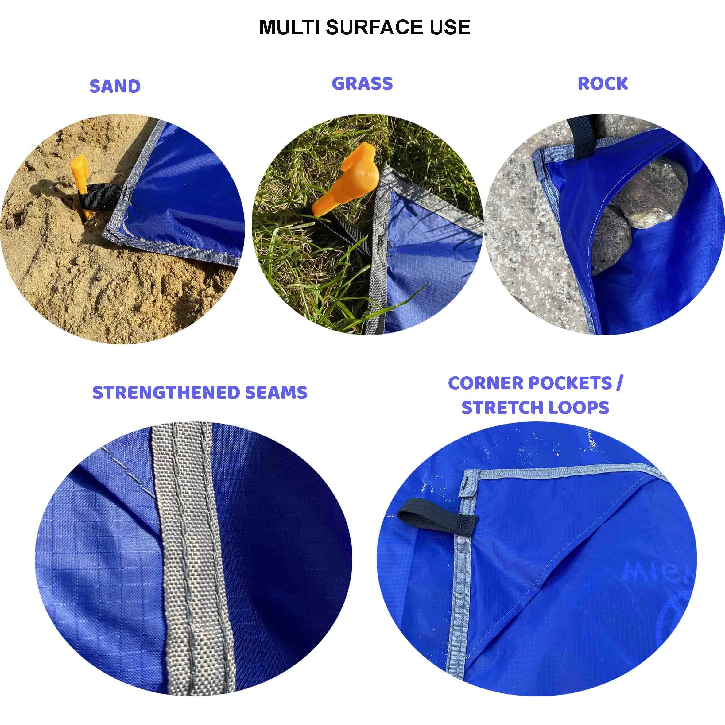 MULTI FUNCTIONAL Landing mat - 4 Stakes Included for soft ground, lawn and beach use. Pocket flaps designed for rugged terrain in windy conditions. Ideal use for SUP Boarding, Canoeing, Kayaking, Scuba Diving, Camping, Yoga Mat, Hiking and other outdoor activities. Can Also be folded giving smaller optional size of 1.55 x 1.45 mts